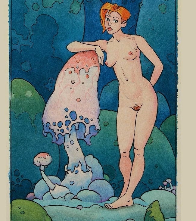 This sixth volume displaying our ongoing selection of sensual art finds, starts with a seductive self-portrait of a young masturbating female painter lying to a rained window (fig.779), followed by a grotesque erotic fantasy by the master surrealist Yoshifumi Hayashi, depicting his famous "stacked nude women" (fig.780). Furthermore, a busty dwarf slave with BDSM collar by the talented Canadian cartoonist Ramon Perez (fig.781), a sleeping nude from Relm's Hologram series (fig.782), a "feminist" collage by Cristina Chelaru (fig.783), an explicit black and white photograph of the seductive model August Hayashi (fig.784), and many more arousing pieces....