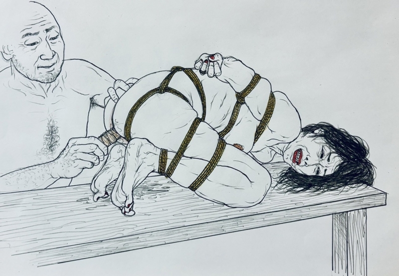 In his X profile info, Taku mentions that creating shunga, bondage, and torture ("lewd") pictures is just a hobby. Since his account In En Garou (The Lewd Pictures Prison or The Erotic Prison –– 淫艶画牢), created in 2023, is updated daily, one may guess that Taku's hobby is actually a true passion. In his images, accompanied by his erotic commentary and fictional stories, the artist focuses on BDSM practices, depicting mature or elderly women trained as slaves for wealthy clients.
