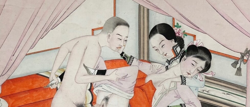 The majority of people portrayed in shunga are common men and women. Here a young married couple make love enthusiastically in their bedroom. We can eavesdrop on their conversation in the text written on the image. The husband compliments his wife, saying, ‘What a great pussy you have – feel like I’m being sucked right in.’ She demands, ‘I want to be pleasured much more.’